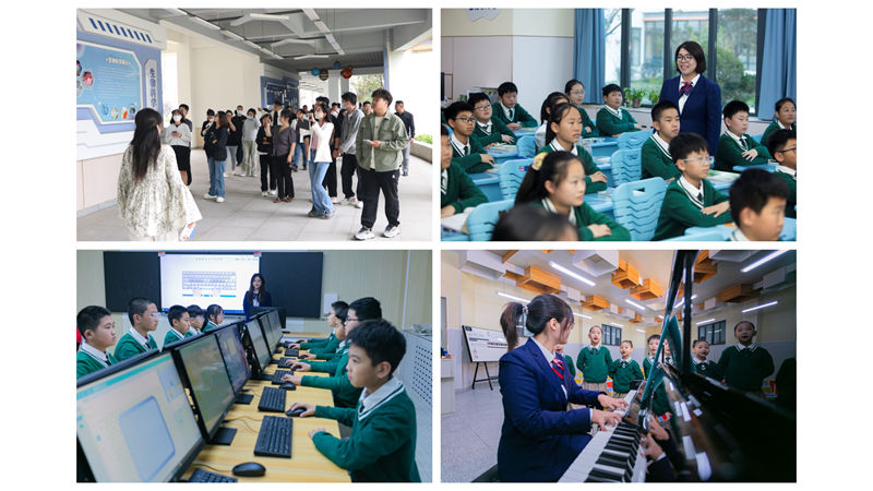 參觀團一行首先觀摩了學生作品展區。繪畫、手工藝品、環保裝置等創意作品琳瑯滿目,充分展現了學生們的藝術才華和創新能力。在教學區,雙語互動課堂和智慧教學場景吸引了參觀者的目光。校方介紹,學校通過多元化社團活動和個性化課程設置,全面促進學生綜合素質發展。